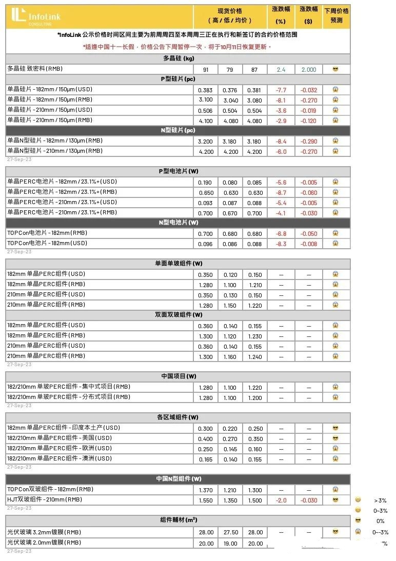 当前硅片与电池片的持续跌价,部分舒缓了组件生产厂家的成本压力,然而,另一方面给予组件端更多的跌价空间,尤其组件环节针对四季度终端需求感受仍未明朗,预期节后需求与排产的起量与否将影响后续跌价幅度与空间。
