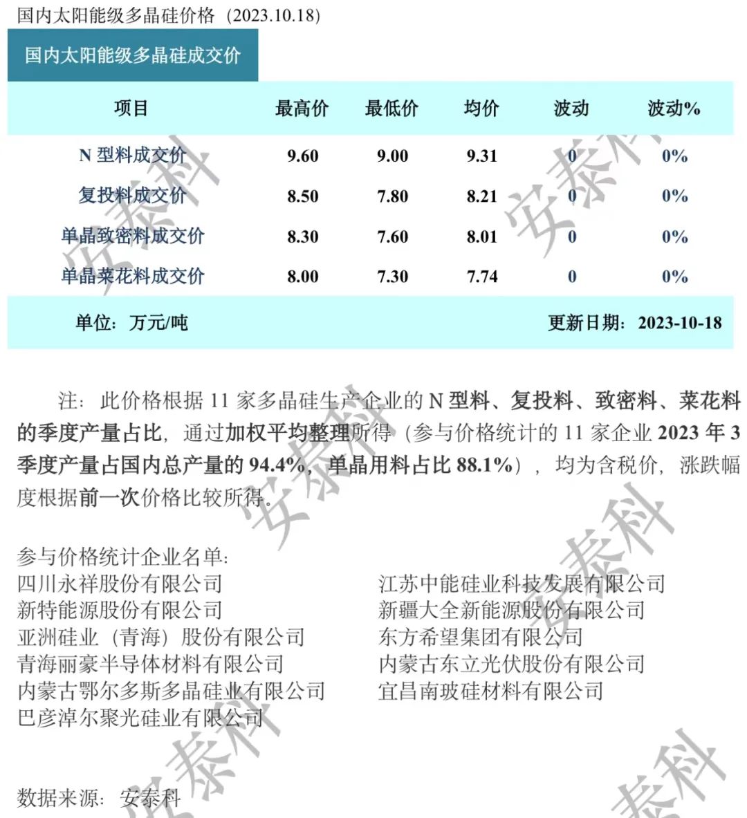 截止本周,国内硅料生产企业合计16家(包含新建投产企业2家),1家企业停产技改,2家企业局部检修,其中1家将在20号左右恢复正常生产。截止目前来看,10月前三周的硅料成交整体偏少,上次询价仅有3家企业有新签单,本次询价大厂均无新增签单,在前期订单基本执行完毕的局势下,未来硅料将会面临更大的降价成交压力。