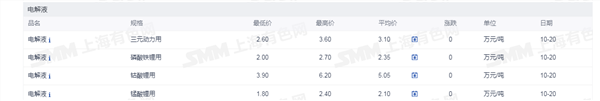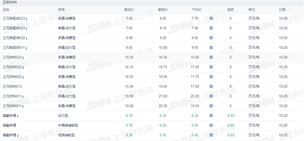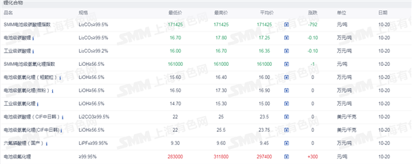 网络整理 2025-09-01 12:57证券之星新能源车行业周报:据上海有色网,截止10月20日,电池级碳酸锂16.70- 17.80万元/吨,均价17.25万元/吨,环比上一工作日下滑0.1万元/吨;工业级碳酸锂16.0-16.7万元/吨,均价16.35万元/吨,环比上一工作日下滑0.1万元/吨。近期锂盐价格走势逐渐趋弱,整体看,当前产业链上下游的僵持行情仍在持续,下游实际需求低迷,对高价锂盐依旧持一种不备、不采的态度,市场整体零单成交较为清淡。而部分厂商在这种情况下,报价下行,市场重心逐步下行,锂盐价格转跌。