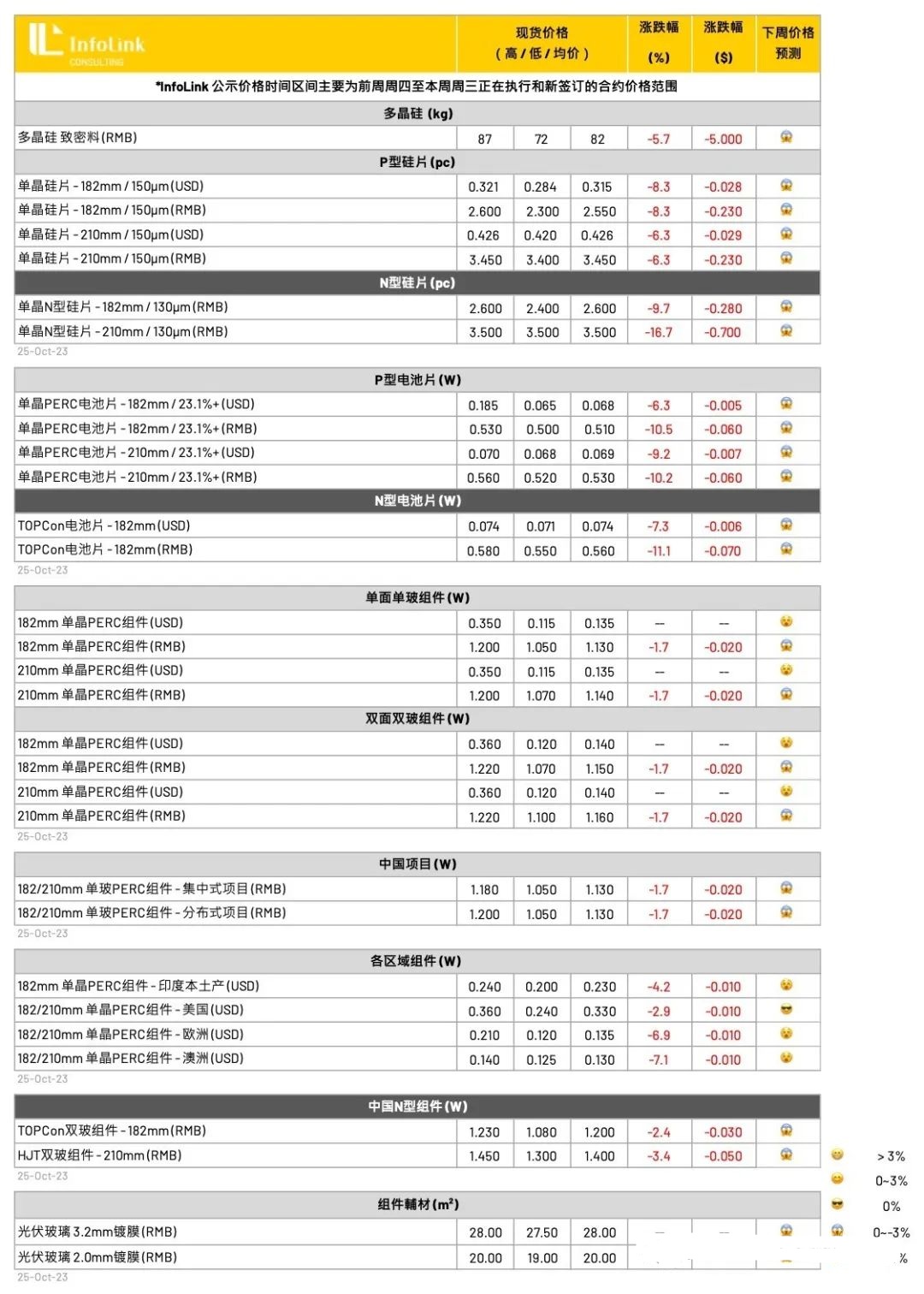 上周开始陆续有新订单的试探性报价,从目前二三线硅料企业包括新进入企业的报价范围来看,已经开始明显下调报价区间,但是随着拉晶环节稼动率的持续走低和硅片价格的加速崩跌,目前硅料新的报价范围显然与买方的预期和接受价格仍有差距,本周难以产生大面积成交,预计11月上旬的成交价格博弈将异常激烈。