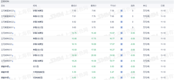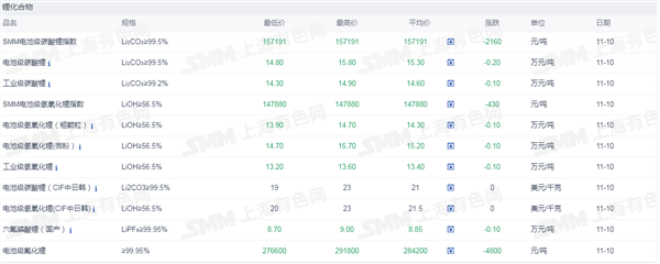 网络整理 2025-09-01 13:27证券之星新能源车行业周报:据上海有色网,截止11月10日,电池级碳酸锂14.8-15.8万元/吨,均价15.3万元/吨,环比上一工作日下滑0.2万元/吨;工业级碳酸锂14.3-14.9万元/吨,均价14.6万元/吨,环比上一工作日下滑0.1万元/吨。上游锂盐企业更多以长单出售为主,挺价心态依旧,但个别锂盐企业随行就市小幅下调出售价格,下游正极材料企业出于降本增效策略,其散单拿货情绪也依旧低迷,近期碳酸锂现货市场成交价格仍呈现下行趋势。