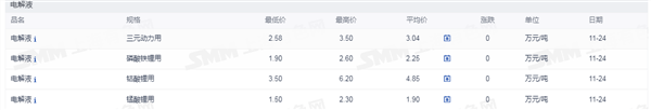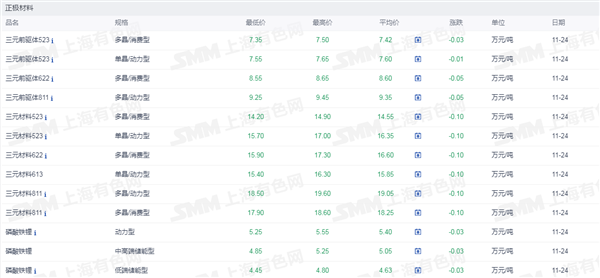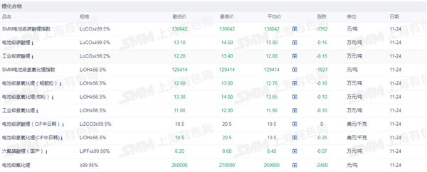 网络整理 2025-09-01 14:06证券之星新能源车行业周报:据上海有色网,截止11月24日,电池级碳酸锂13.1-14.5万元/吨,均价13.8万元/吨,环比上一工作日下滑0.15万元/吨;工业级碳酸锂12.2-13.4万元/吨,均价12.8万元/吨,环比上一工作日下滑0.15万元/吨。今日锂盐企业延续挺价出售散单的态度,依然以长单出货为主;而在近期碳酸锂现货价格连续下跌后,下游少部分正极材料企业采买情绪略微转变,个别正极材料企业在现货价格低位时期进行少量采买,但整体现货市场的散单成交量级仍较平淡,并未出现明显放量情况。