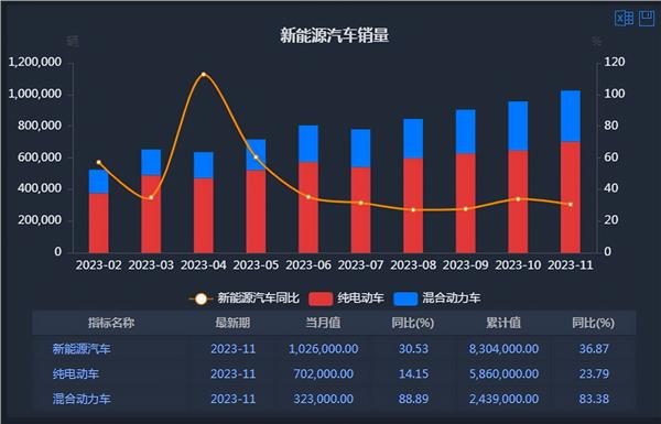 12月27日,中国电动汽车百人会副理事长兼秘书长张永伟表示,2023年中国汽车整体销量有望突破3000万辆,预计2024年势头仍将延续,汽车类零售额将突破5万亿元,其中新能源汽车突破2万亿元。2024年中国新能源汽车保有规模将接近3000万辆,其中纯电动占比约80%。预计2024年我国新能源汽车产销规模有望达到1300万辆,增速约40%,整体渗透率超过40%,乘用车领域单月渗透率有望超过50%。