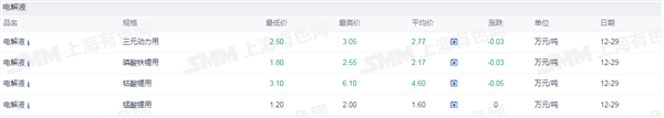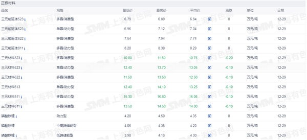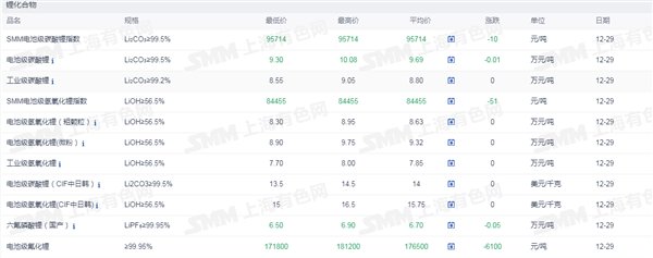 网络整理 2025-09-01 17:39证券之星新能源车行业周报:据上海有色网,截止12月29日,电池级碳酸锂9.3-10.08万元/吨,均价9.69万元/吨,环比上一工作日下滑0.01万元/吨;工业级碳酸锂8.55-9.05万元/吨,均价8.80万元/吨,环比上一工作日持平。临近年末,市场成交依旧维持清淡局面。当前贸易商因近期期现货价差扩大,进行持续期现货套利,对锂盐端采买需求小幅增加,而部分盐厂在期货价格相对较高的情况下,交仓意愿亦有所增强,供应端挺价情绪渐浓,市场维持弱稳局面。