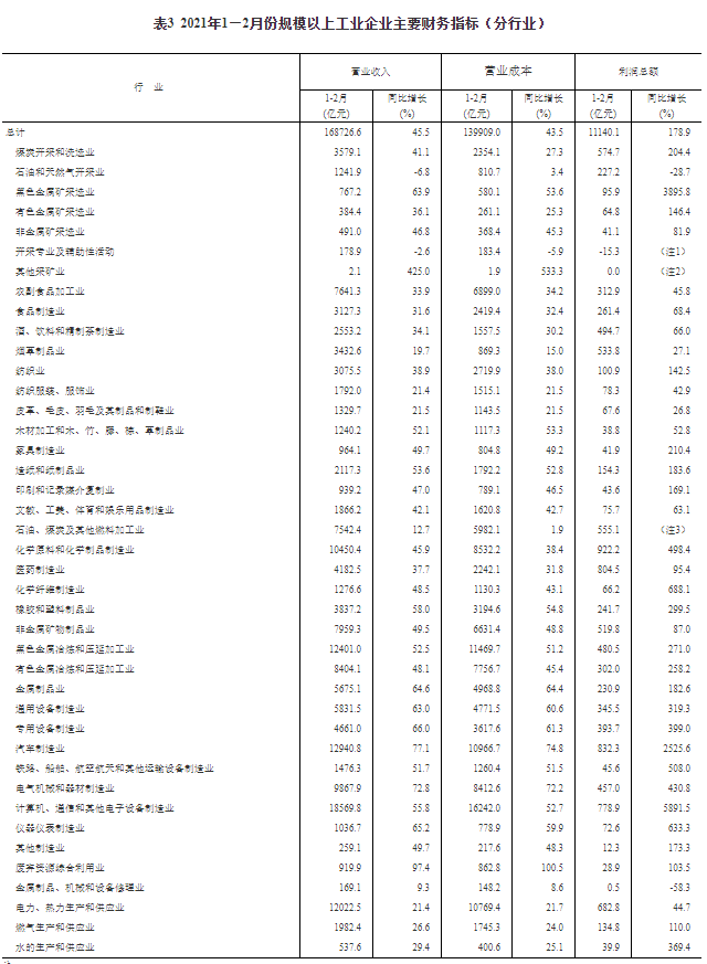1—2月份,全国规模以上工业企业实现利润总额11140.1亿元,同比增长1.79倍(按可比口径计算,详见附注二),比2019年1—2月份增长72.1%,两年平均增长31.2%。