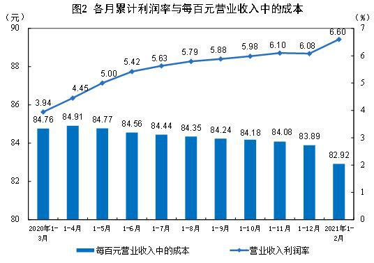 1—2月份,规模以上工业企业实现营业收入16.87万亿元,同比增长45.5%;发生营业成本13.99万亿元,增长43.5%;营业收入利润率为6.60%,同比提高3.15个百分点。