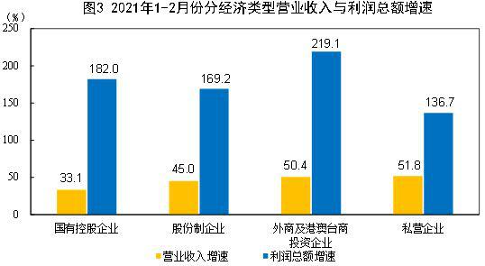 1—2月份,规模以上工业企业中,国有控股企业实现利润总额3752.2亿元,同比增长1.82倍;股份制企业实现利润总额7762.5亿元,增长1.69倍;外商及港澳台商投资企业实现利润总额3145.2亿元,增长2.19倍;私营企业实现利润总额3316.9亿元,增长1.37倍。