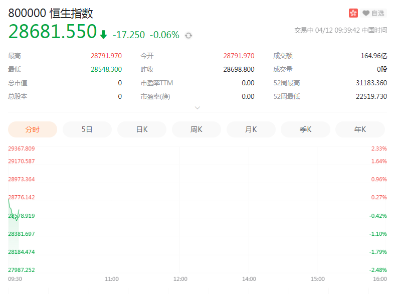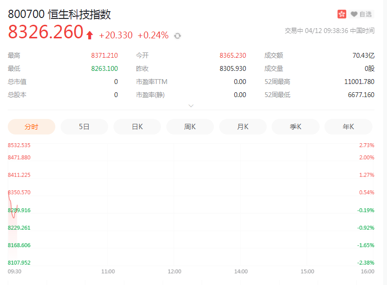 4月12日周一,港股恒生指数高开0.32%,恒生科技指数开盘涨0.71%。