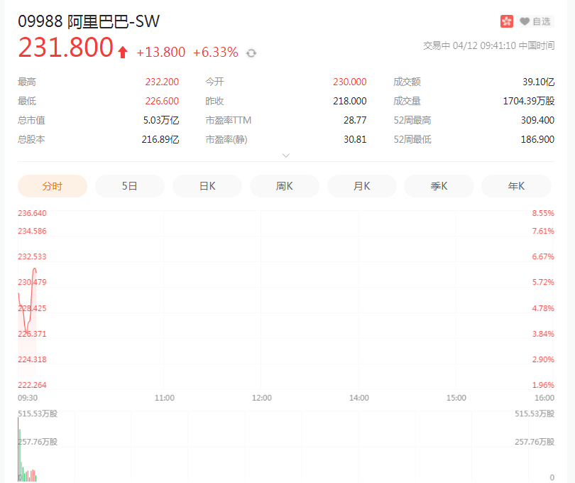 阿里巴巴港股开盘大涨5.5%,腾讯控股微跌0.73%,百度跌近2%,京东集团微跌0.32%。