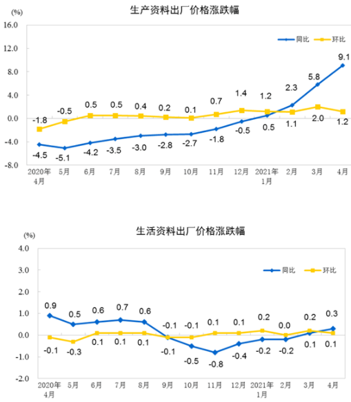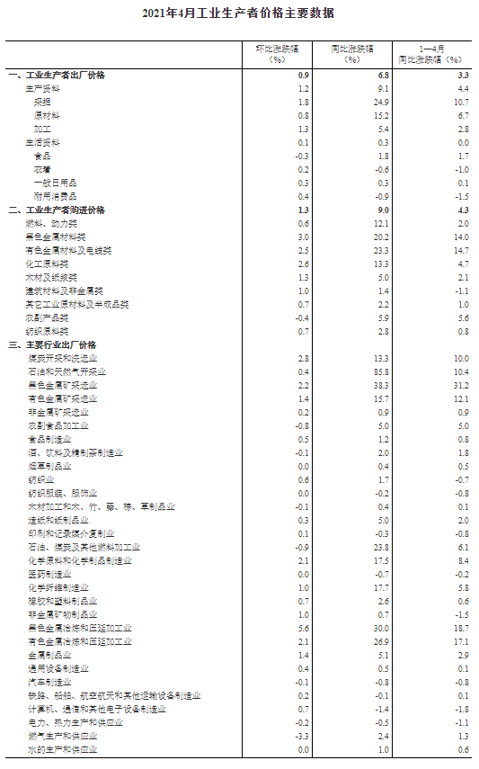 2021年4月份,全国工业生产者出厂价格同比上涨6.8%,环比上涨0.9%;工业生产者购进价格同比上涨9.0%,环比上涨1.3%。1—4月平均,工业生产者出厂价格比去年同期上涨3.3%,工业生产者购进价格上涨4.3%。