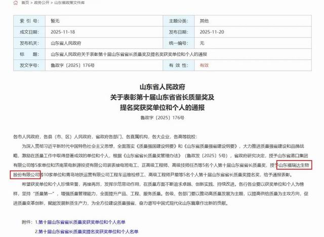 11月20日,山东省人民政府网站发布《山东省人民政府关于表彰第十届山东省省长质量奖及提名奖获奖单位和个人的通报》。山东福瑞达生物股份有限公司凭借在质量管理与经营创新方面的卓越表现,荣登“第十届山东省省长质量奖提名奖”榜单。