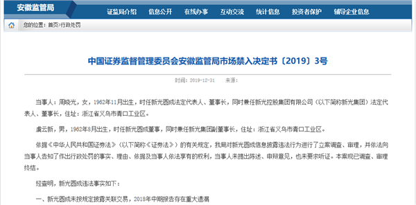 2019年12月31日,安徽证监局发布的市场禁入决定书显示,周晓光、虞云新夫妇担任ST新光董事、实际控制人期间,其指使、安排新光集团非经营性占用上市公司资金的关联交易事项、上市公司违规担保事项、共同借款事项,不履行信息披露义务,情节严重。依据相关规定,二人被安徽证监局采取10年证券市场禁入措施。