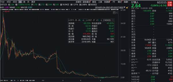 而二级市场上,贵人鸟也因连续三年亏损被ST,曾经市值超400亿,如今股价也自2015年高点跌去超95%,最新市值只有41亿元。