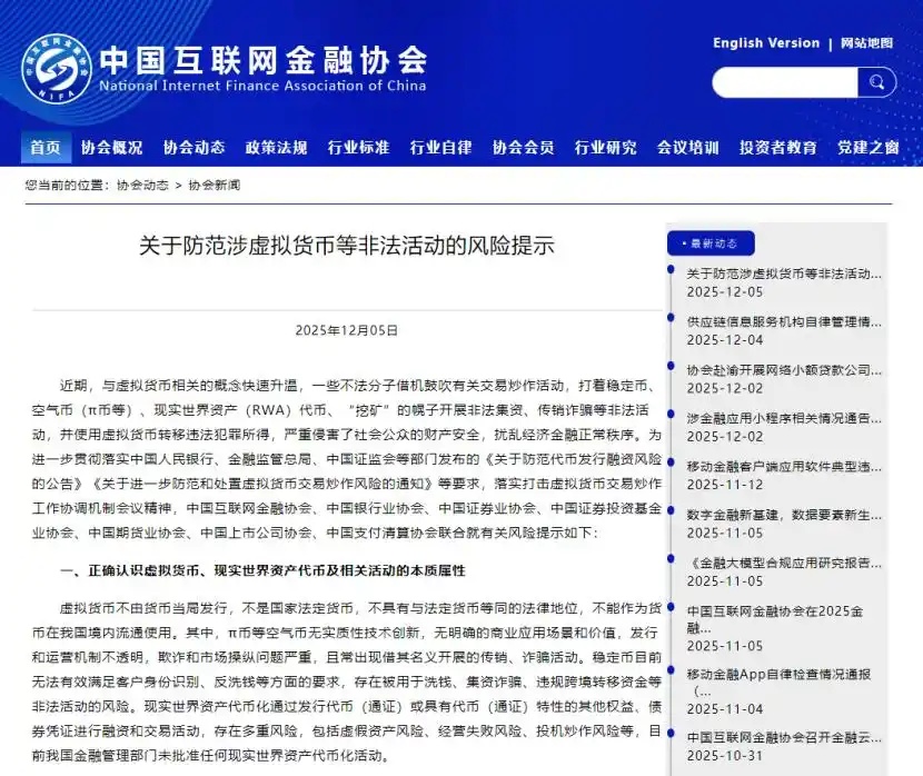 网络整理 2025-12-14 18:0612月5日,中国互联网金融协会、中国银行业协会、中国证券业协会、中国证券投资基金业协会、中国期货业协会、中国上市公司协会、中国支付清算协会等七家协会联合发布《关于防范涉虚拟货币等非法活动的风险提示》(以下简称《提示》)。《提示》特别提到,虚拟货币领域已成为传销、非法集资等非法活动的高发区,社会公众需高度警惕。
