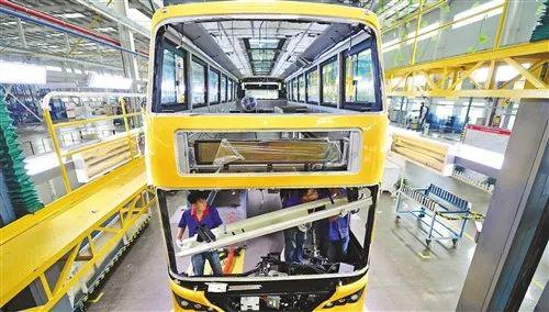 6月27日,在西安比亚迪纯电动客车基地内,工人在一辆K8S纯电动双层客车内安装配件。 新华社记者 邵 瑞摄