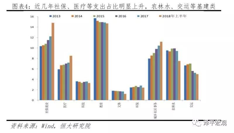 减税降费的同时盘活财政存量资金,加快专项债发债进度以更加积极地推进财政政策。扩大内需不再是传统的过剩产能和无效投资,而是分区域、分类别投资以及民生改善。近几年来,我国一般公共预算支出结构不断优化,其中用于社保就业和医疗的占比从2013年的10.3%和5.9%分别提高至2018年上半年的14.8%和8.5%,用于农林水、交运等基建类项目的占比从2013年的9.5%和6.7%下降到2018年上半年的7.5%和5%。