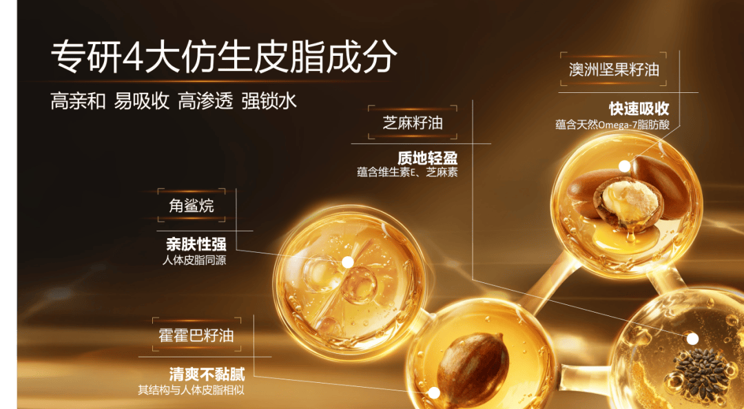 这4大仿生皮脂成分科学配比,不仅彻底解决了传统精华油“油腻难吸收”的痛点,更实现了深润5保湿、 强韧屏障的核心功效,为后续焕亮6肌肤、抗皱功效的发挥打下坚实基础。