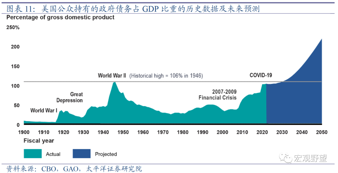 从美国历史经验来看,货币政策通常比财政政策更容易“妥协”。美国财政预算需要国会两院和白宫共同决定,通常博弈较为激烈。历届政府也大多不愿在自己的任期内实施大规模的财政紧缩。美国国会预算办公室(CBO)每年都会发布未来的政府债务率预测。对比2010年CBO发布的财政预算报告,可以看出10年来美国实际债务率的增长基本是按照当年最快的假设路径来发展的。这也反映出美国财政紧缩的阻力确实较大。所以,在极高的政府债务率的背景下,美联储的货币政策实际上面临很大的压力,尤其是这一压力会滞后发生,需要提前应对。因此我们认为美联储货币政策的空间已经不大,可能在一季度两次加息之后,就会终止加息周期。